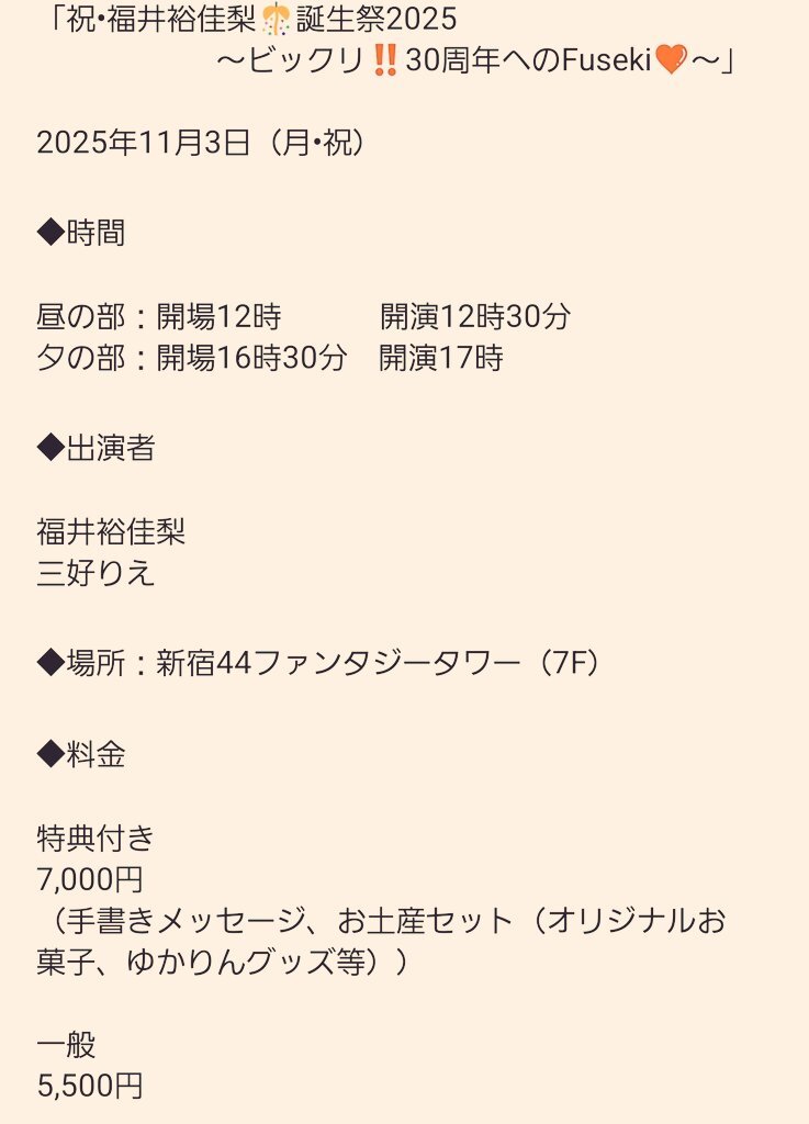 次は、来年の30周年記念イベント ✨ りえちゃんが、 豪華に行きたいなぁと また 何が起こるかも解りませんが、 また、皆さんと、楽しく! より、幸せな時間にして行く事が出来るように✨☺️✨と 思います。✨✨ 宜しくお願い申し上げます。✨ #福井裕佳梨誕生祭2025 pic.x.com/DjfLNhIwm3