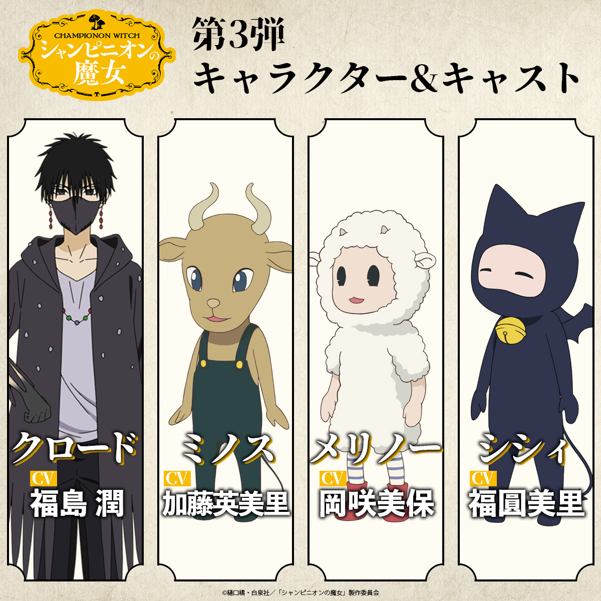 .˚⊹⁺‧ 第3弾キャラクター&キャスト ‧⁺ ⊹˚. 追加発表🍄 クロード:cv.#福島潤 ミノス:cv.#加藤英美里 メリノー:cv.#岡咲美保 シシィ:cv.#福圓美里 公式サイトではプロフィール&キャストコメントも公開! champignon-pr.com/#anchor-chara TVアニメ『#シャンピニオンの魔女』 pic.x.com/Z6Do3BU1jL