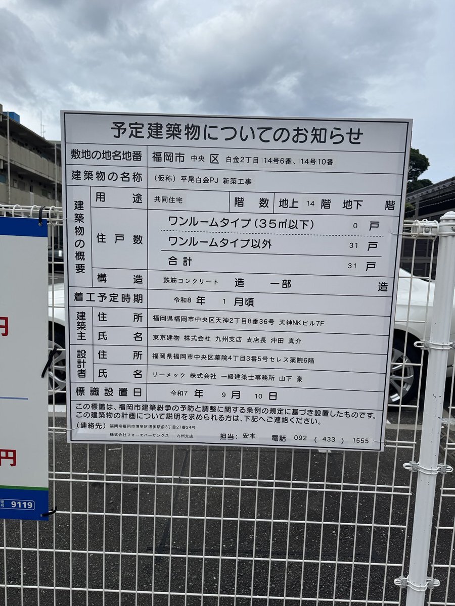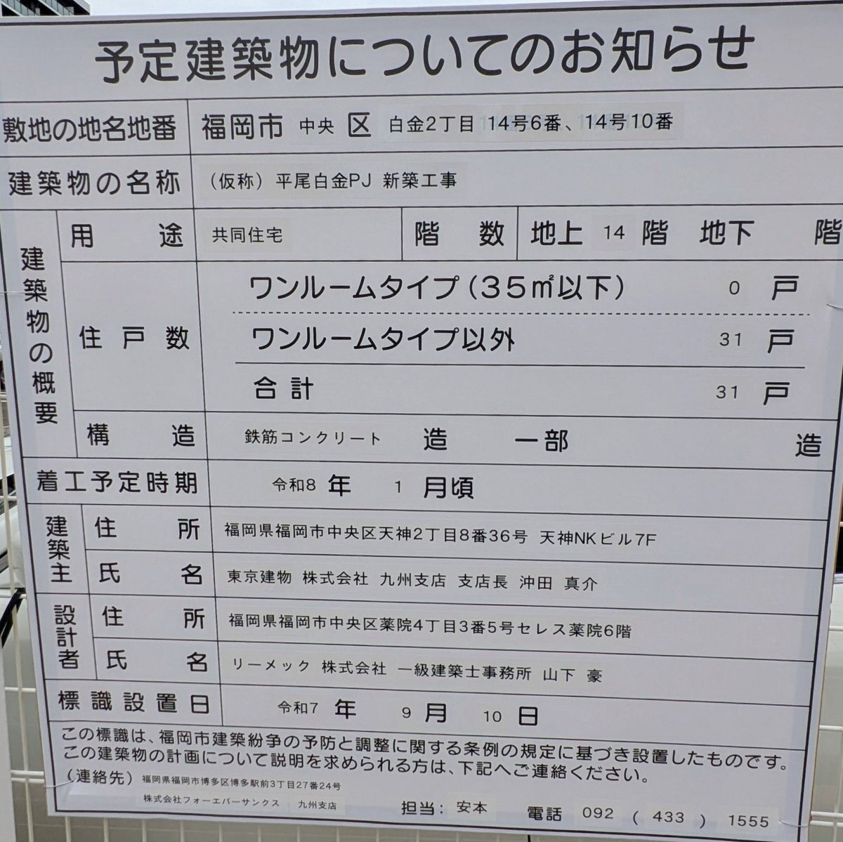 こちらの現調🙏 東京建物の新築マンション計画「平尾白金PJ」 #福岡予定建築物 ✅️14階建て・全31戸 ✅️設計:リーメック ✅️薬院駅徒歩約12分 ✅️2026年1月着工予定 福岡市の東建の分譲マンションだと、2021年の「ブリリアタワー西新」以来でしょうか。設計がリーメックなので期待大ですね。 pic.x.com/erzBe8mn7n x.com/01scarsNovel/s…