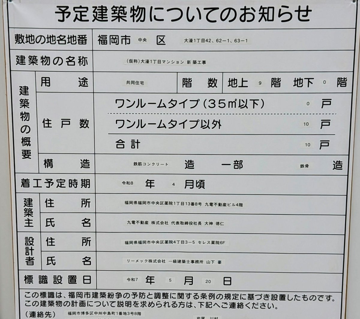大濠1丁目マンション新築工事 #福岡予定建築物 ✅️9階建・全10戸 ✅️建築主:九電不動産 ✅️設計:リーメック ✅️六本松駅徒歩9分、大濠公園徒歩1分 こりゃ買えそうにない😇 x.com/fukunaman/stat…