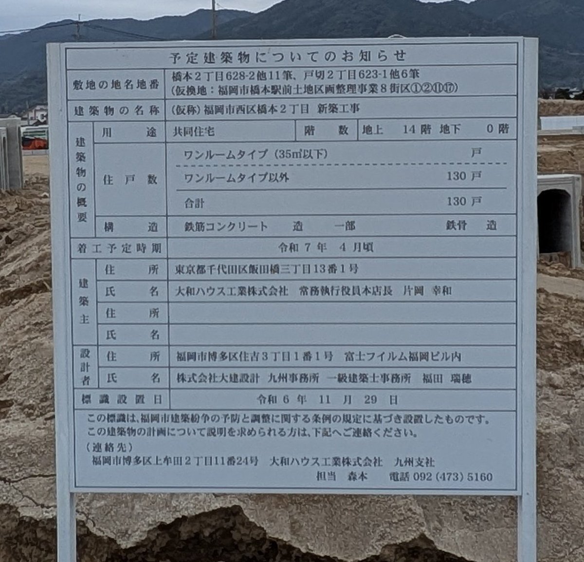 福岡市西区橋本2丁目に、大和ハウスの新築マンションが建設予定。 #福岡予定建築物 14階建て・全130戸で、地下鉄七隈線の始発駅の橋本駅徒歩約2分位。設計は大建設計。 かなり大規模なプロジェクトですね。駅前にはショッピングモール「木の葉モール」があり、ファミリー世帯に便利な環境。