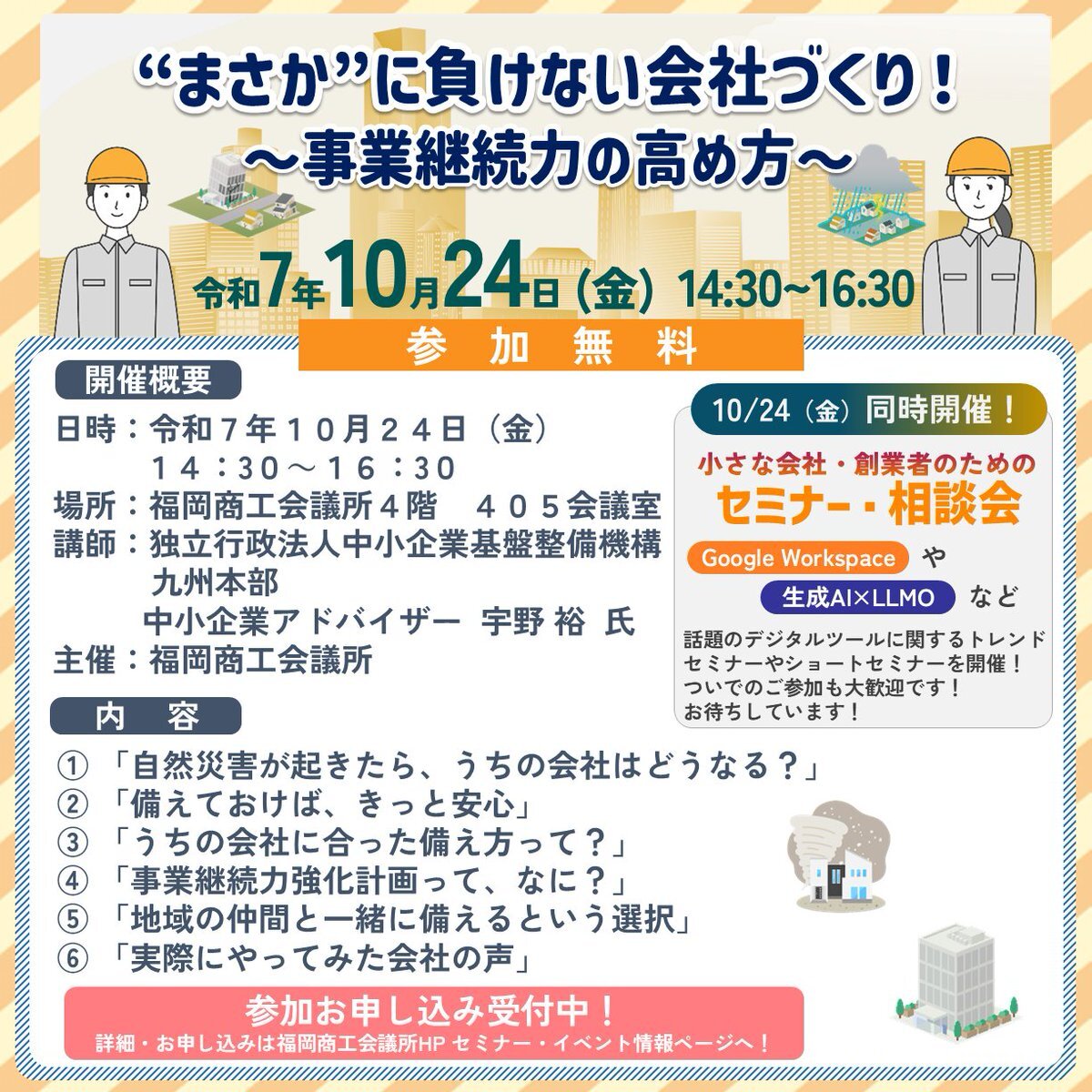 10月24日開催💡 #事業継続力強化計画 セミナーのご案内! 突然の災害やトラブルに備える!取り組みやすい防災・減災の工夫、#事業継続力 を高めるポイントを事例を交えて解説します✍ ただいま申込受付中! 🔗fukunet.or.jp/fcci-events/ev… #福岡商工会議所 #BCP #防災 #減災 pic.x.com/FEPdJkwR8Q
