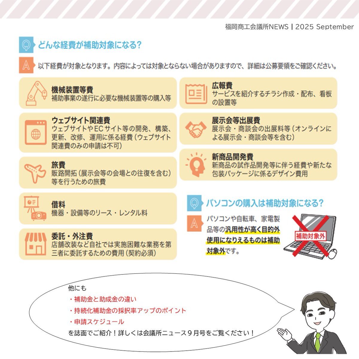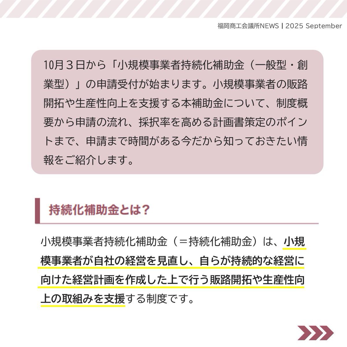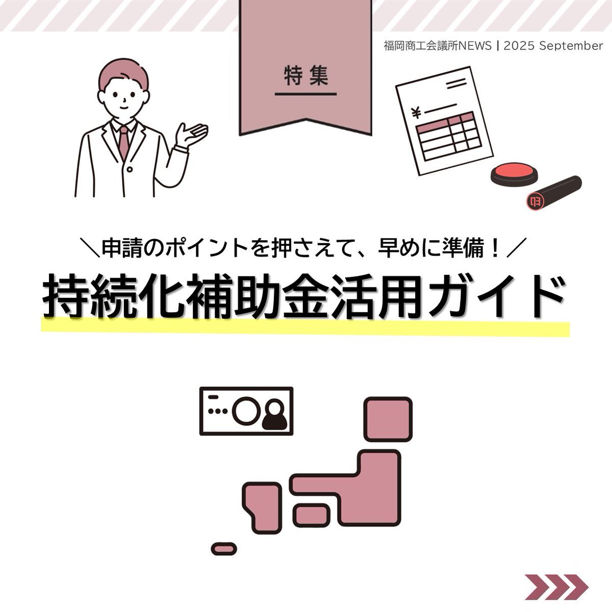 #福岡商工会議所NEWS 9月号🌕🍁   🔎#特集🔎 申請のポイントを押さえて、早めに準備! 「持続化補助金活用ガイド」   紙面では、「補助金と助成金の違い」や「持続化補助金の採択率アップのポイント」などをご紹介!🙋🏻‍♂️   🔗fukunet.or.jp/about/news/   #福岡商工会議所 pic.x.com/7Pbtmbp45O