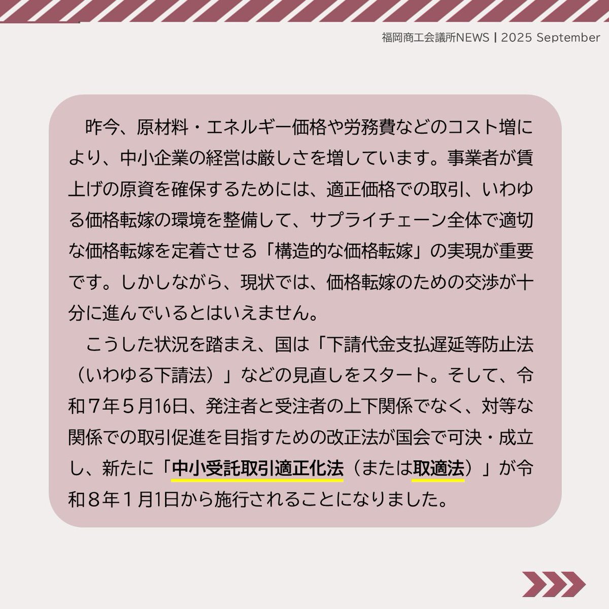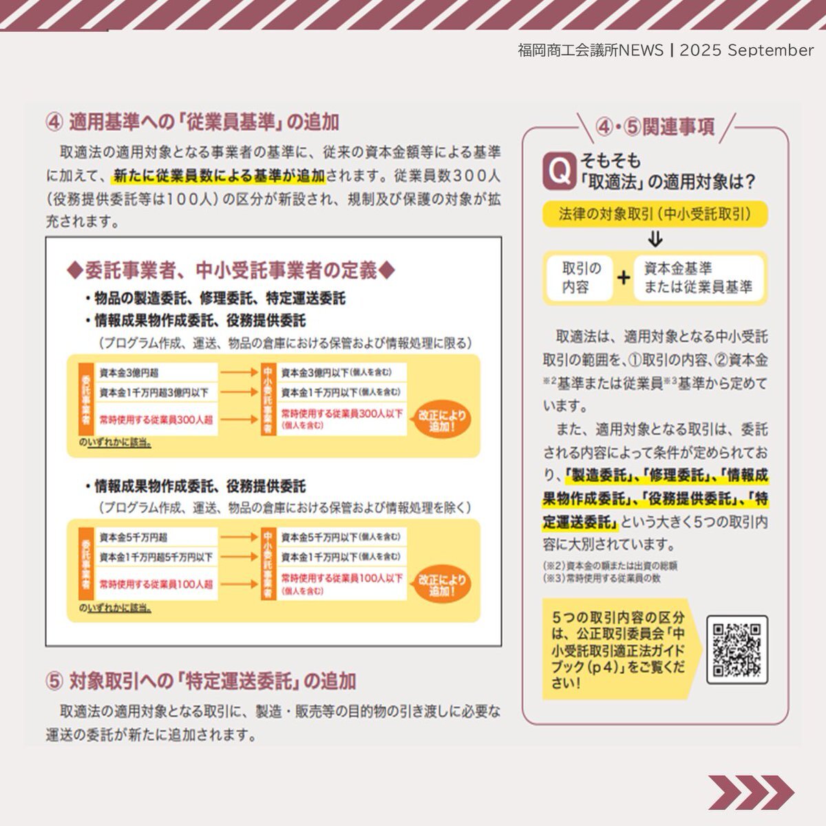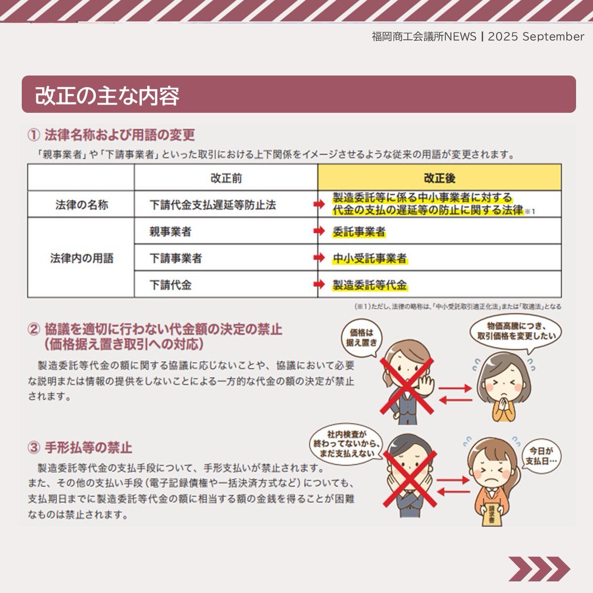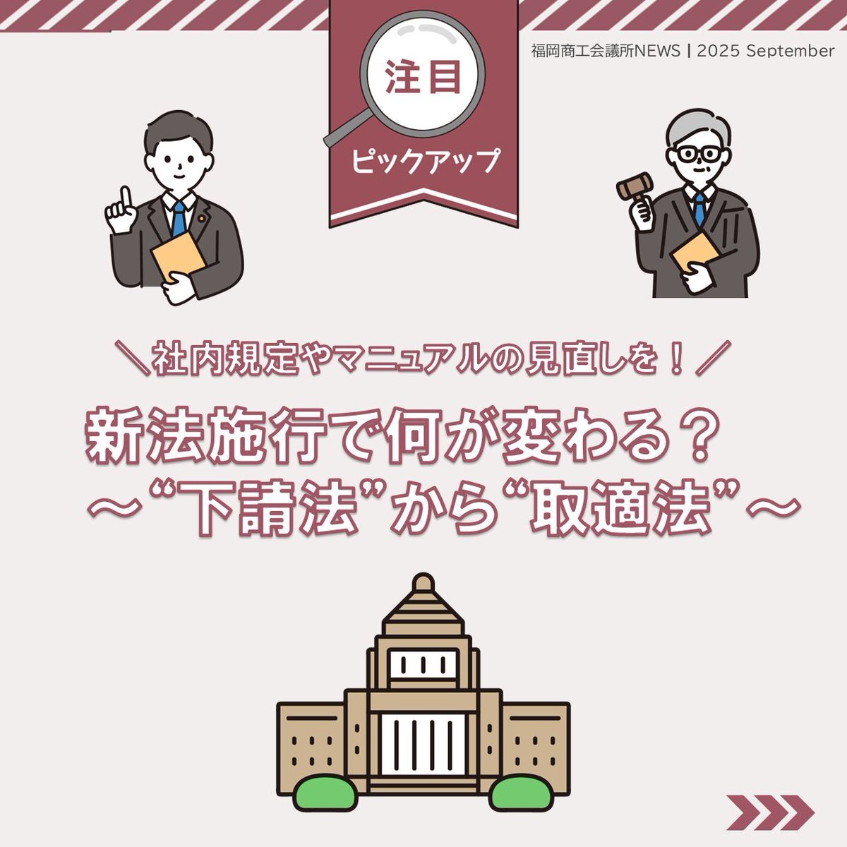 #福岡商工会議所NEWS 9月号🌕🍁 🔍#注目ピックアップ🔎 \社内規定やマニュアルの見直しを!/   新法施行で何が変わる?    ~”下請法”から”取適法”~ 詳細は紙面をチェック!!📖 🔗fukunet.or.jp/about/news/   #福岡商工会議所 pic.x.com/VQoSOy5uA9