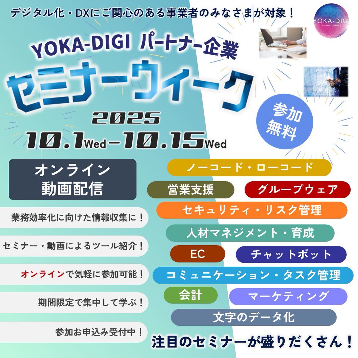 \本日からオンライン開催💡/ 【YOKA-DIGIパートナー企業        セミナーウィーク】 営業DX、組織改善、人事評価、顧客情報活用、紙媒体の電子化、販促、タスク管理、ノーコードツールの情報・ノウハウをオンライン・動画配信でご提供🌱参加受付中です✨ #福岡商工会議所 #デジタル化 #DX pic.x.com/GxaL0a4Qs9