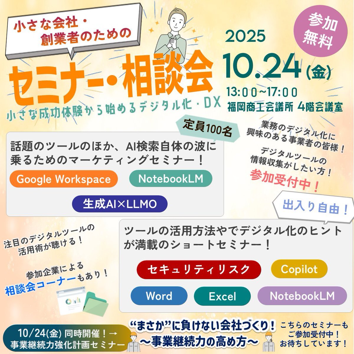10月24日開催💡セミナー・相談会のご案内! Google workspaceやNotebookLMのほか、生成AI×LLMOの実践など、注目のツール活用術が満載のセミナーを開催します! ただいま事前申込を受付中です✨ 🔗fukunet.or.jp/fcci-events/ev… #福岡商工会議所 #デジタル化 #DX #マーケティング #デジタルツール pic.x.com/cvtG7zGsbT