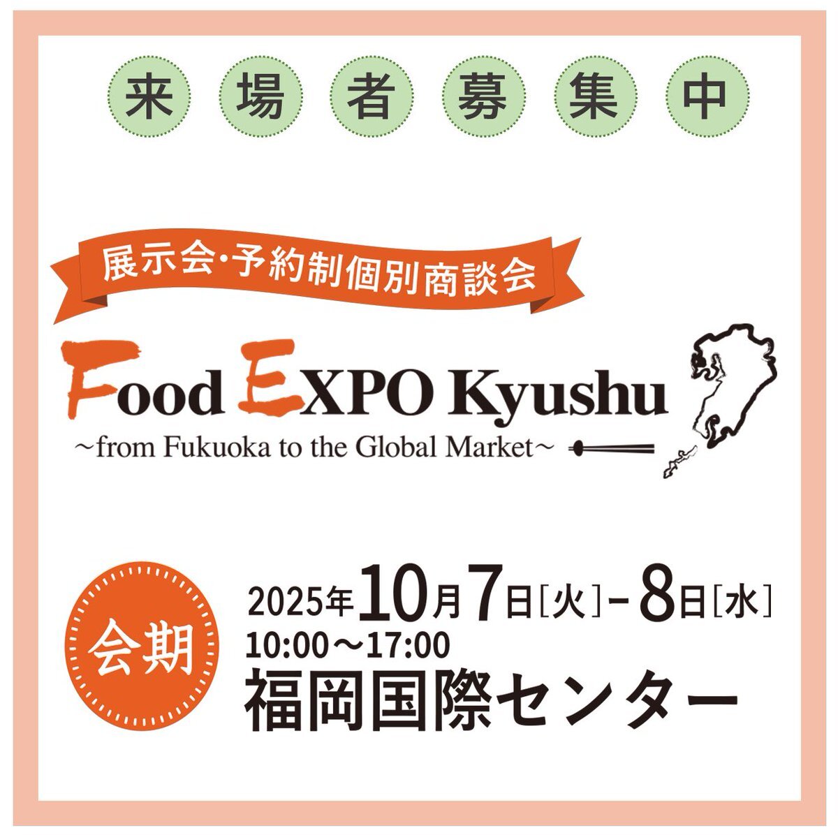 🌱いよいよ来週開催!来場者募集中🌱 国内外食品商談会   ~Food EXPO Kyushu~ 九州の食品メーカー約290社・団体が出展✨マッチングや情報収集に絶好の機会です!   来場申込🔗foodexpokyushu.com   #foodexpokyushu #福岡商工会議所 #商談会 #食品商談会 pic.x.com/dKNDUimXIT
