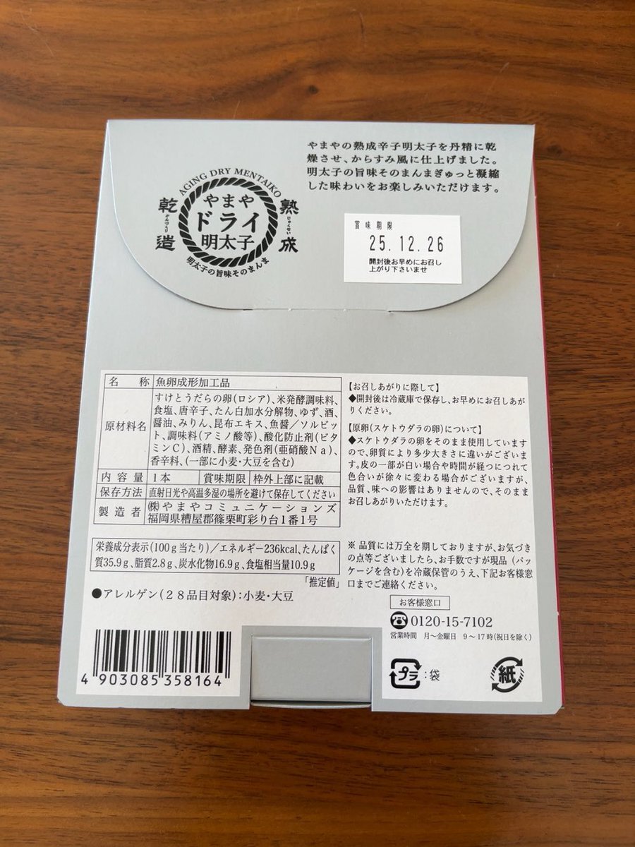 海外に明太子送りたいな〜と調べていて見つけた「やまやドライ明太子」を買ってきました。 カラスミみたいな雰囲気で、味は濃いです。ちょびちょび食べてちょうど良さそう。 薦められるがままに試食し、おいしくて色々買ってしまいました。 #卵乳不使用 #福岡土産 onlineshop-yamaya.com/item.html?pn=3… pic.x.com/bSgPAIC0rM