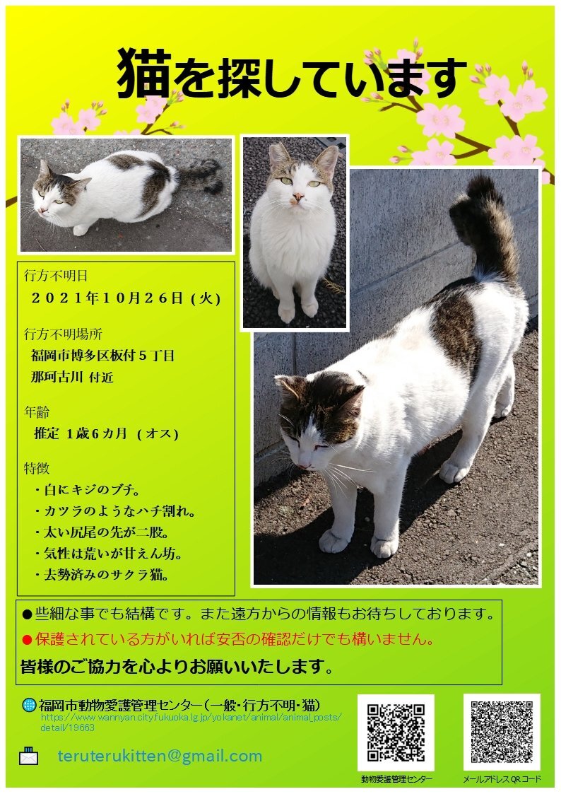 福岡市博多区板付で行方不明になった猫を探しています。1ヵ月間、半径1km圏内の捜索、近所での聞き込み、ポスティングなど手を尽くしてみましたが未だに見つからず。皆様のご協力を切にお願いしたいと思います。 #行方不明 #迷子 #猫 #ねこ #猫又 #福岡 #拡散希望 #猫を探しています