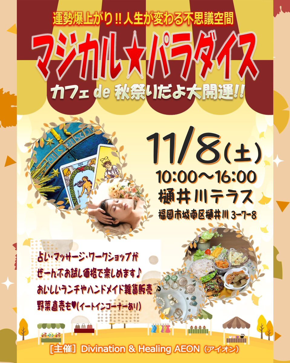 本日は『 #マジカル★パラダイス vol.19 カフェde秋祭りだよ大開運!!』に出店中です! 木の温もりを感じる会場でお悩みを占ってみませんか? ワークショップや野菜の販売・ランチなどもあります✨ お待ちしてます! #占い #イベント #福岡市城南区 #福岡 pic.x.com/RCOTFdo50r