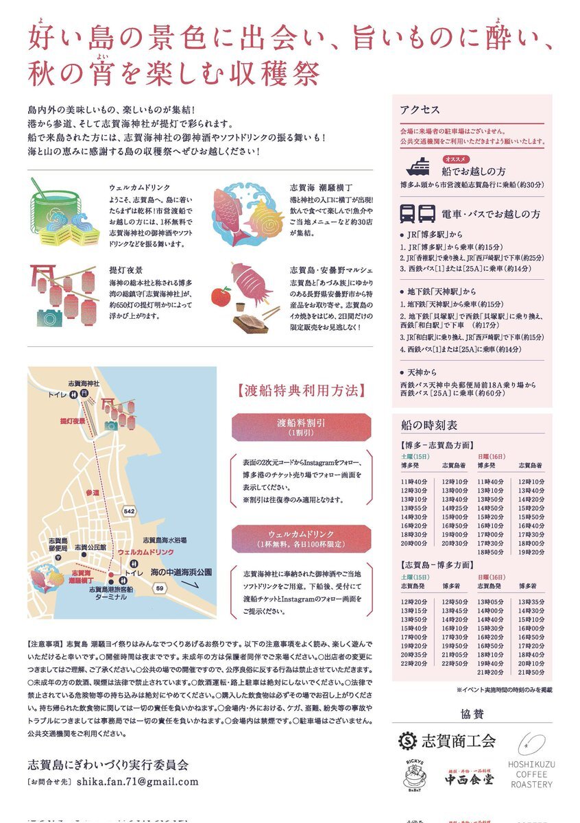 今週末、志賀島でイベントが行われます!ぜひ遊びに来てください😄✨instagram.com/_shika.fan/?ap… #イベント #福岡市 #福岡市東区 #志賀島 pic.x.com/cWV0rubT5s