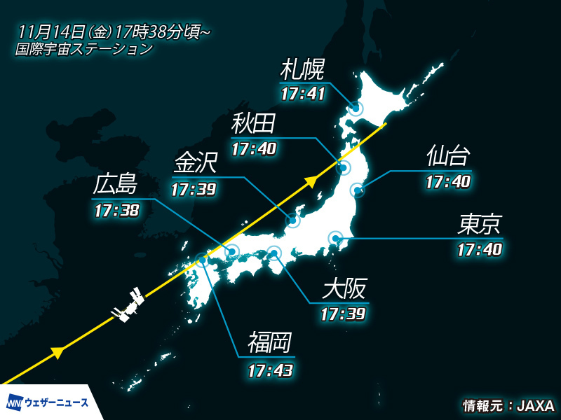 【今夜、ISSが日本上空を通過】 国際宇宙ステーション(ISS)/きぼうが、今日14日(金)の夕方17時38分頃から日本付近を通過します。夜空を見上げて、国際宇宙ステーションの姿を探してみてください。 ▼見られそうかどうか天気を解説 weathernews.jp/news/202511/13…