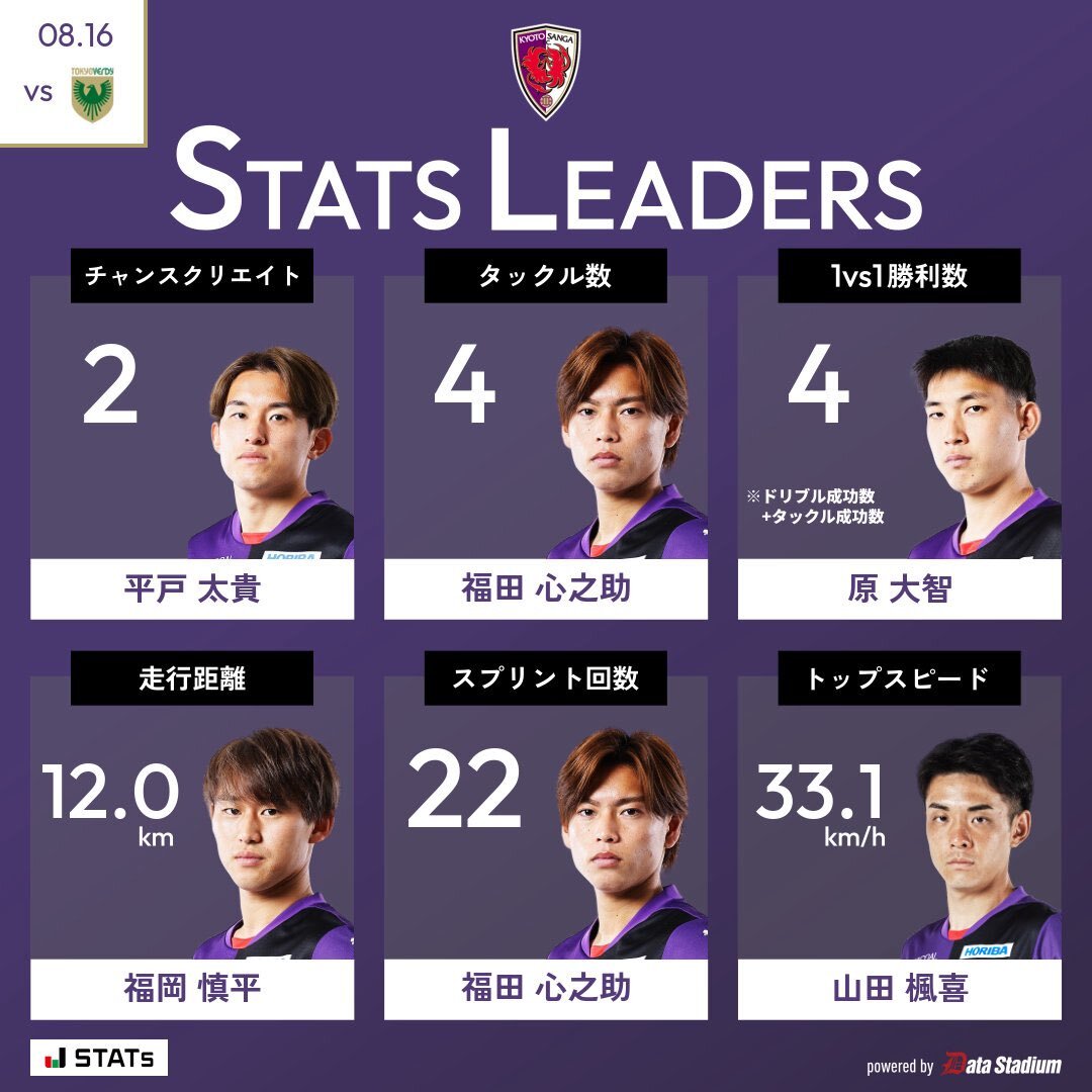 👑スタッツリーダー チャンスクリエイト: #マルコトゥーリオ タックル数: #須貝英大 1vs1勝利数: #須貝英大 走行距離: #福岡慎平 スプリント回数: #福田心之助 トップスピード: #ラファエルエリアス #sanga #京都サンガ pic.x.com/A2fsCBjDWe