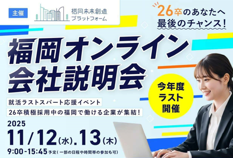 \福岡オンライン会社説明会を開催/ 主に26卒の就活を頑張っている学生と、福岡都市圏の企業をつなぐオンライン会社説明会を開催します。 福岡で働きたい学生の皆様ぜひご活用ください💪 📅11/12(水)、11/13(木)9時~ 詳しくはこちら city.fukuoka.lg.jp/keizai/keieish…