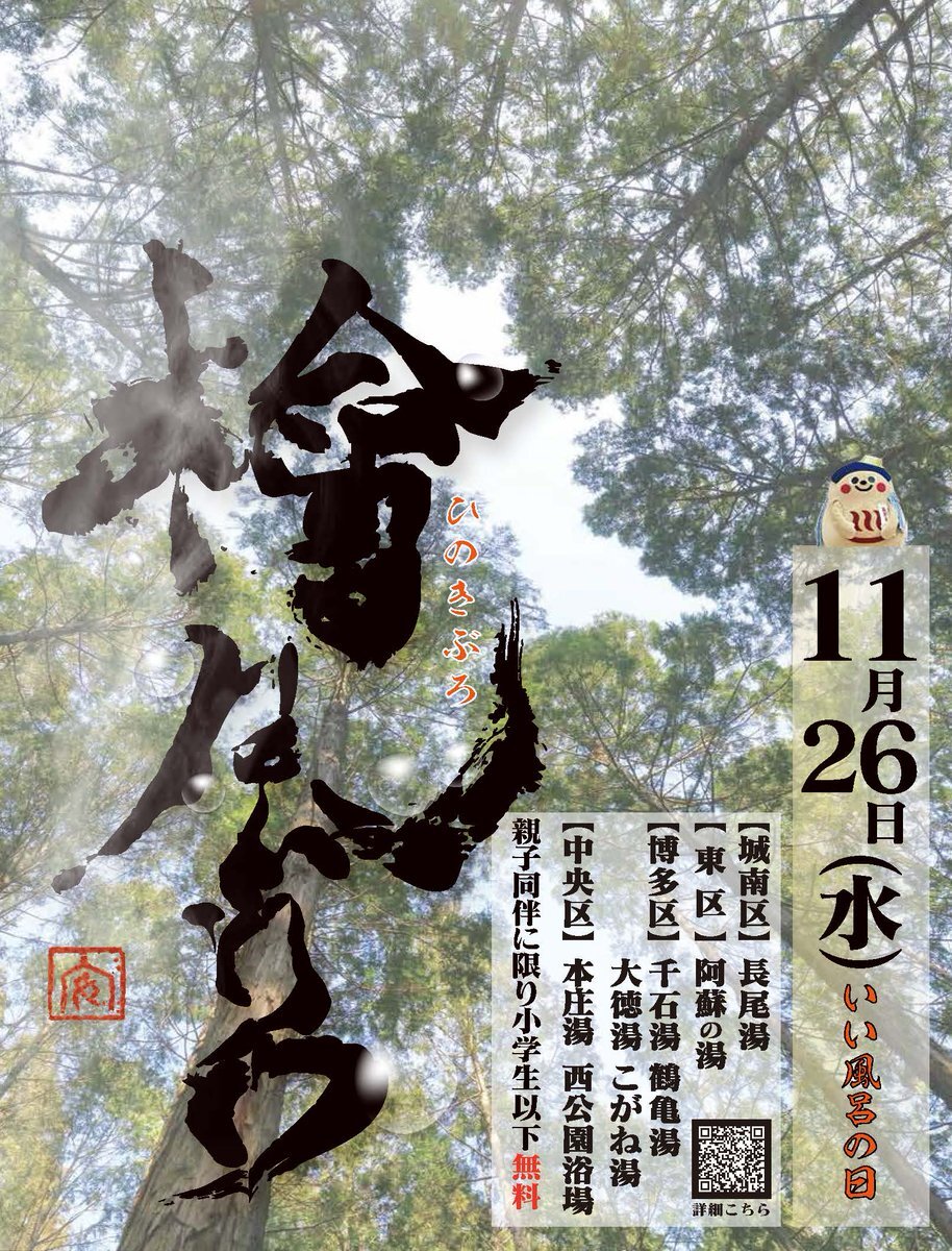 【保健所通信】 「いい風呂の日(ひのきの湯)」を開催します♨ 🗓開催日 11/26(水) ※本庄湯、長尾湯は定休日のため11/25(火)に開催 📍場所 市内の銭湯 8施設 ♨入浴料金 大人(12歳以上):550円 ※親子同伴に限り小学生以下無料 詳細はこちら👇 city.fukuoka.lg.jp/hofuku/hokensh…