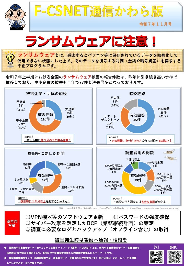 【事業者向け】ランサムウェアに注意!令和7年上半期における全国のランサムウェア被害の報告件数は、昨年に引き続き高い水準で推移しており、中小企業の被害も半年で77件と過去最多になっています。企業の実態に応じた適切な対策を講じてください。 #福岡県警 pic.x.com/I2xBfxre7R