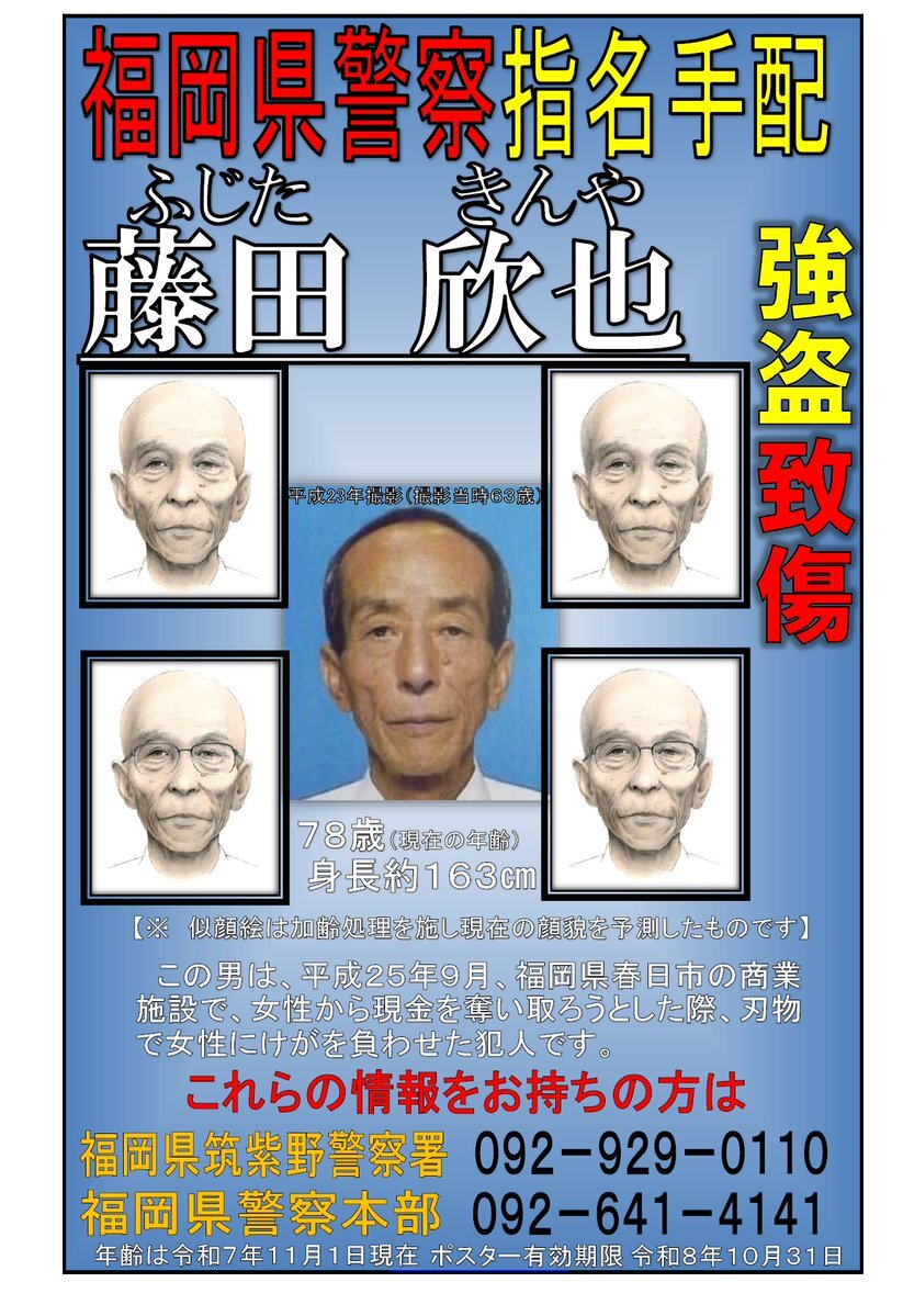 【刑事総務課】指名手配被疑者の検挙にご協力を‼️ 写真の男は、強盗致傷事件の被疑者#藤田欣也(ふじたきんや)です。この顔にピンときたら、迷わず110番通報を📞 #福岡県警 #110番 #指名手配」police.pref.fukuoka.jp/jiken-jiko/01.… pic.x.com/wrJO6azM4d