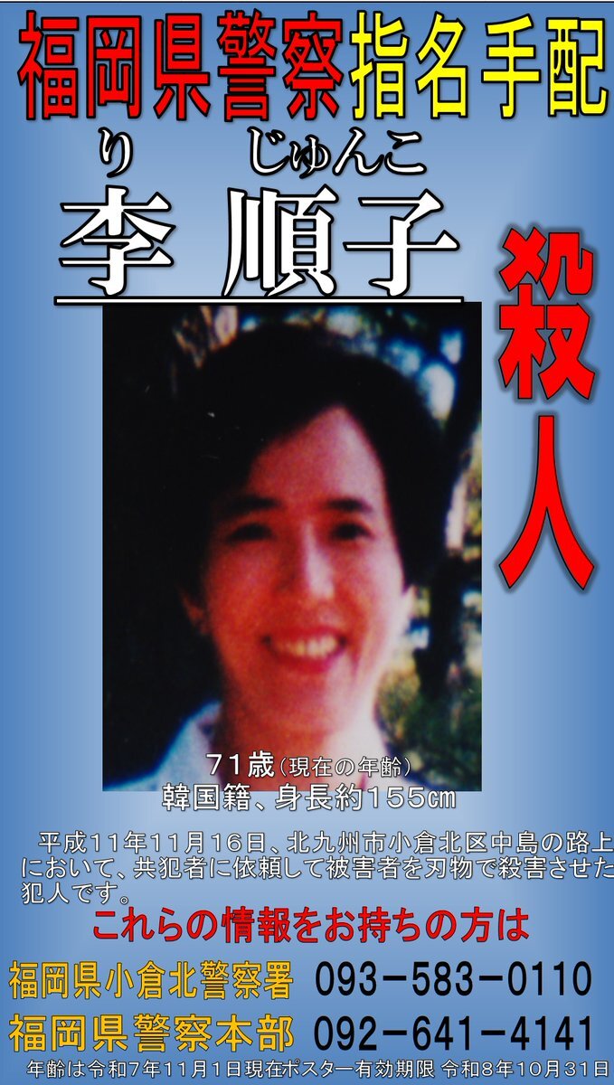 【刑事総務課】指名手配被疑者の検挙にご協力を‼️ 写真の女は、殺人事件の被疑者 #李順子(りじゅんこ)です。この顔にピンときたら、迷わず110番通報を📞 #福岡県警 #110番 #指名手配 police.pref.fukuoka.jp/jiken-jiko/01.… pic.x.com/nk7SKuI1Td