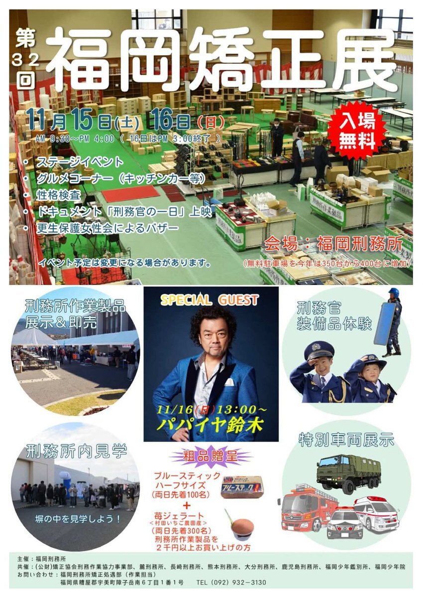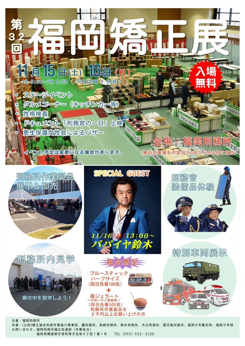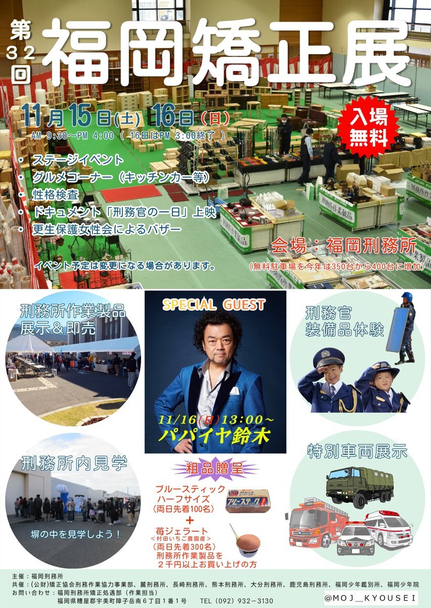 福岡刑務所でも矯正展を行います。 令和7年 11月15日(土)9時30分~16時 / 翌16日(日)9時30分~15時 #刑務所作業製品の展示即売 #刑務所内見学 #刑務官の装備品体験 etc... 🌟スペシャルゲストとしてパパイヤ鈴木さんがご登場します!(16日13時~) 皆様のご来場お待ちしております。#福岡矯正展 x.com/MOJ_KYOUSEI/st…