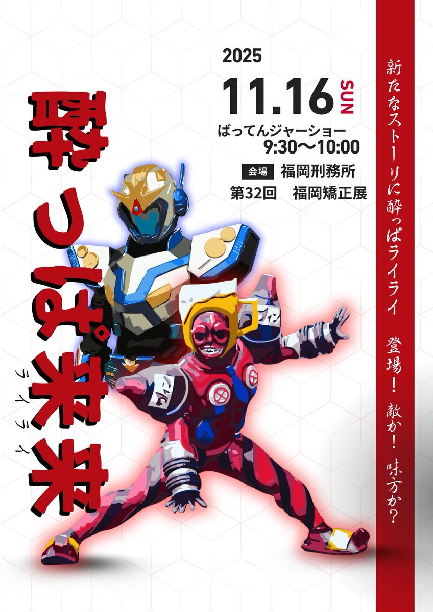 (イベント活動) 2025.11.16(日) ◯福岡矯正展 ・ばってんジャーショー 時間 9:30~10:00 場所 福岡刑務所内 福岡県糟屋郡宇美町障子岳南 6丁目1−1 #福岡刑務所 #福岡矯正展 #ばってんジャー pic.x.com/npSQjP3Agw
