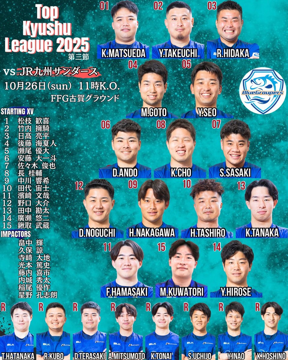 トップキュウシュウリーグ2025 第三節 予選リーグ最終戦! 是非熱いご声援をお願いします📣📣 〈日時〉 2025年10月26日(日) 11:00 〈対戦相手〉 JR九州サンダース 〈場所〉 FFG古賀G #FFGブルーグルーパーズ #福岡銀行ラグビー部 #福岡銀行 #戦う銀行員 #戦う証券マン #戦う会社員 #ffgenergy #Link pic.x.com/jP3IIw6Y2l