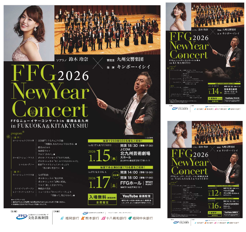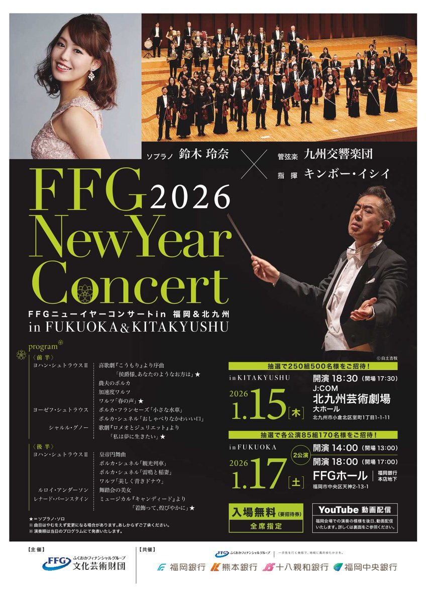 FFGニューイヤーコンサート2026 福岡公演 1/17(土)昼14:00開演、夜18:00開演 FFGホール 指揮 #キンボー・イシイ ソプラノ #鈴木玲奈 #九州交響楽団 #九響 抽選で各公演85組170名様をご招待🎁 受付期間:~11月30日(日) fukuoka-fg.com/sustainability… 後日🎦Youtubeにて配信あり! #福岡銀行 pic.x.com/ye3zJ44XxF