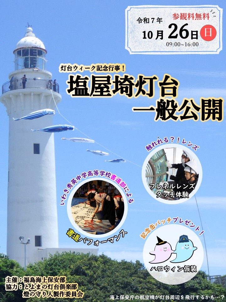 \ 10/26(日) #塩屋埼灯台 一般公開のおしらせ / 〇いわき秀英中学高等学校書道部による「書道パフォーマンス」 〇触われる?!レンズ「フレネルレンズタッチ体験」 〇ハロウィン仮装での来場者には「記念缶バッチプレゼント」 など! #海上保安庁 #二管海保 #福島海上保安部