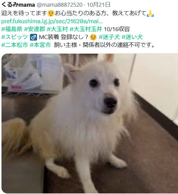 残念ながら迎えなく #里親募集 になりました😔 pref.fukushima.lg.jp/sec/21620a/jot… 素敵なご縁💗祈ってます🙏 #福島県 里親募集中 大玉村 #迷子犬 迷い犬 スピッツ ♂️ タケ君 pic.x.com/dJiPi0eKhF