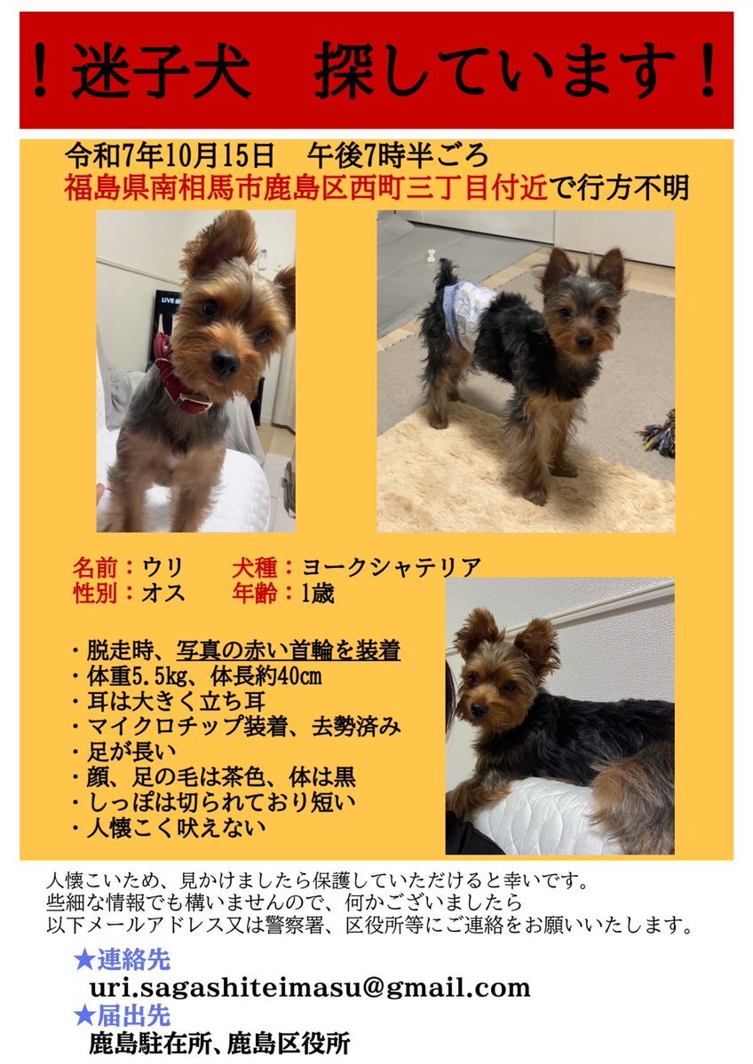 🐶🆘【#福島県迷子犬】🎈 🔷2025.10.15 🔴南相馬市鹿島区西町3丁目付近で散歩中迷子になった〝うり君♂〟を探しています🐾 🍀うり君発見の際は警察への通報及び投稿主さんへのご連絡をお願い致します🙇‍♂️ #迷子犬 #南相馬市 #鹿島区西町 #真野川 #ヨークシャテリア迷子 pic.x.com/H79eDLZmz8 x.com/ufsmarcgbu7524…