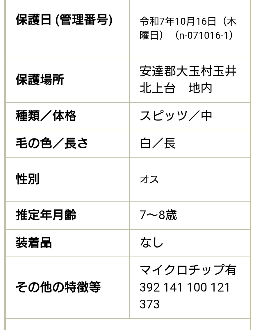 拡散希望📣📣📣 #迷子犬 #迷い犬 10/16 #福島県 #福島県迷子犬 #大玉村 #玉井 #北上台 #スピッツ オス 白 📍推定7歳〜8歳 📍装着品なし 📍MC有( 392 141 100 121 373) 二本松市 伊達市 本宮市 桑折町 国見町 川俣町 大玉村 #福島県動物愛護センター本所 ☎024-953-6400 pref.fukushima.lg.jp/sec/21620a/mai…