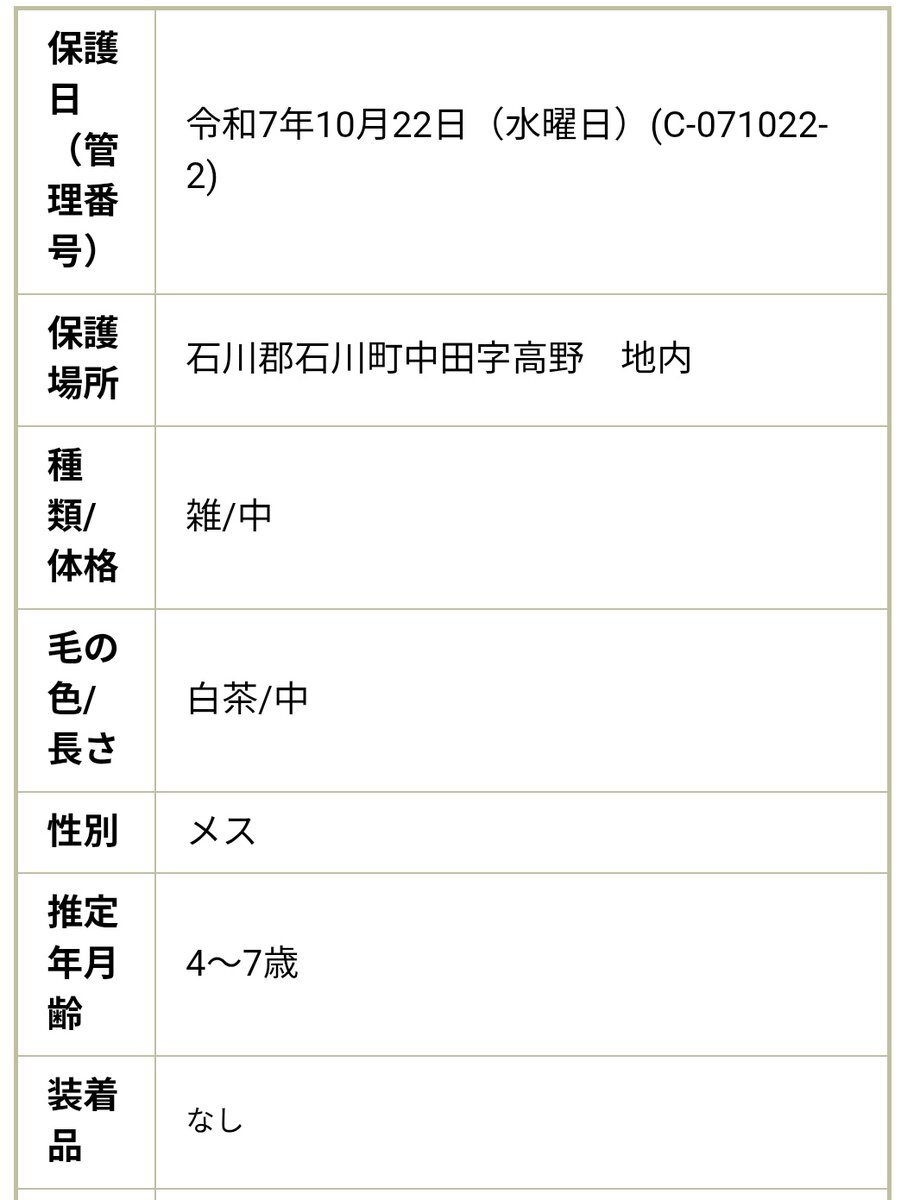 まだお迎えないようです 福島県のみならず 他県の方も確認を #迷子犬 #迷い犬 10/22 #福島県 #福島県迷子犬 #石川郡 #石川町 中田高野 #雑種犬 メス 白茶 📍装着品なし 📍推定4〜7歳 🔴連絡先🔴 #福島県動物愛護センター本所 ☎024-953-6400 pic.x.com/bPtGJ7PuqN x.com/CLASSICLETSFOL…