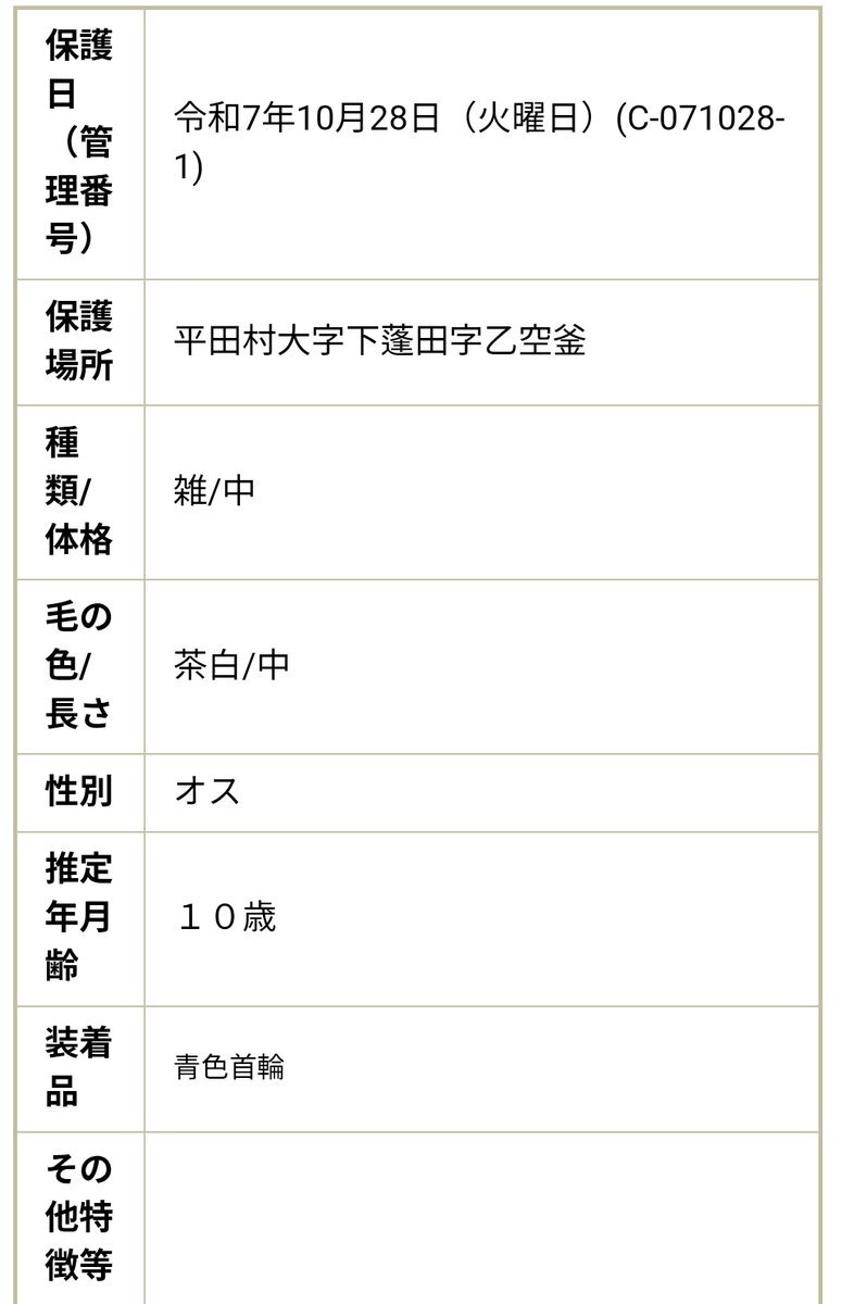 拡散希望📣📣📣 #迷子犬 #迷い犬 10/28 #福島県 #福島県迷子犬 #平田村 #下蓬田 #乙空釜 #雑種犬 オス 茶白 📍青色系首輪 📍推定10歳 須賀川市 田村市 鏡石町 天栄村 玉川村 平田村 浅川町 古殿町 三春町 小野町 🔴連絡先🔴 #福島県動物愛護センター本所 ☎024-953-6400 pref.fukushima.lg.jp/sec/21620a/mai…