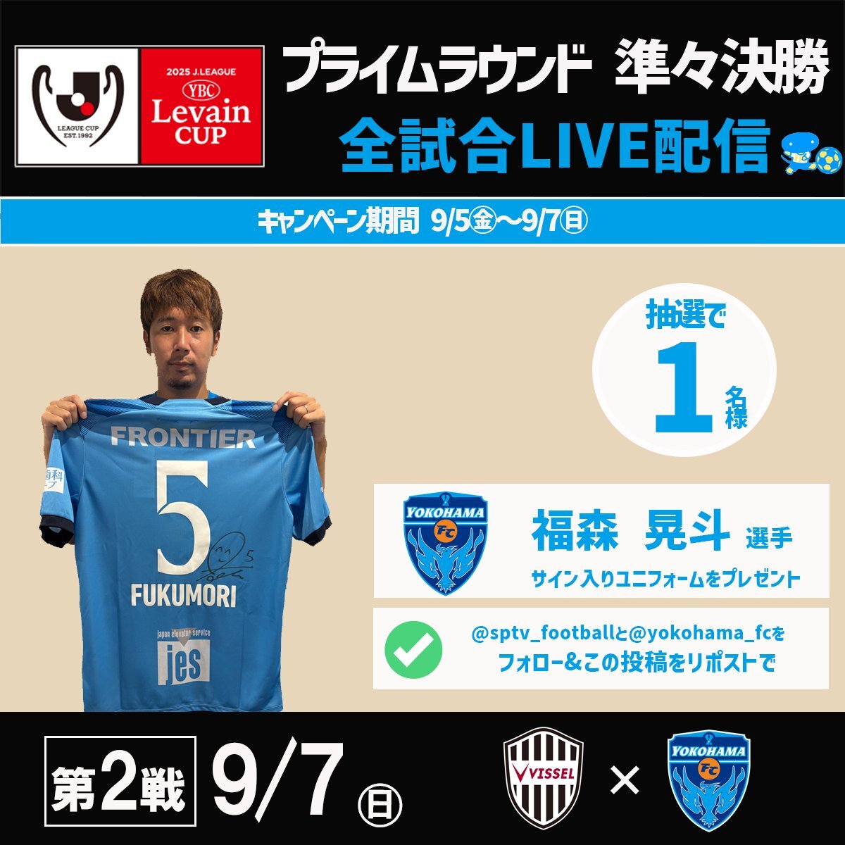 🏆#ルヴァンカップ ✨プライムラウンド 準々決勝第2戦 📅9/7(日)開催🔥 ✨✨黄金の左足✨✨ 横浜FC #福森晃斗 選手サイン入りユニフォームを抽選で1⃣名様にプレゼント🎁 ✅応募方法 ① @sptv_football@yokohama_fc をフォロー ② この投稿をリポスト pic.x.com/OjNI0u1ys4