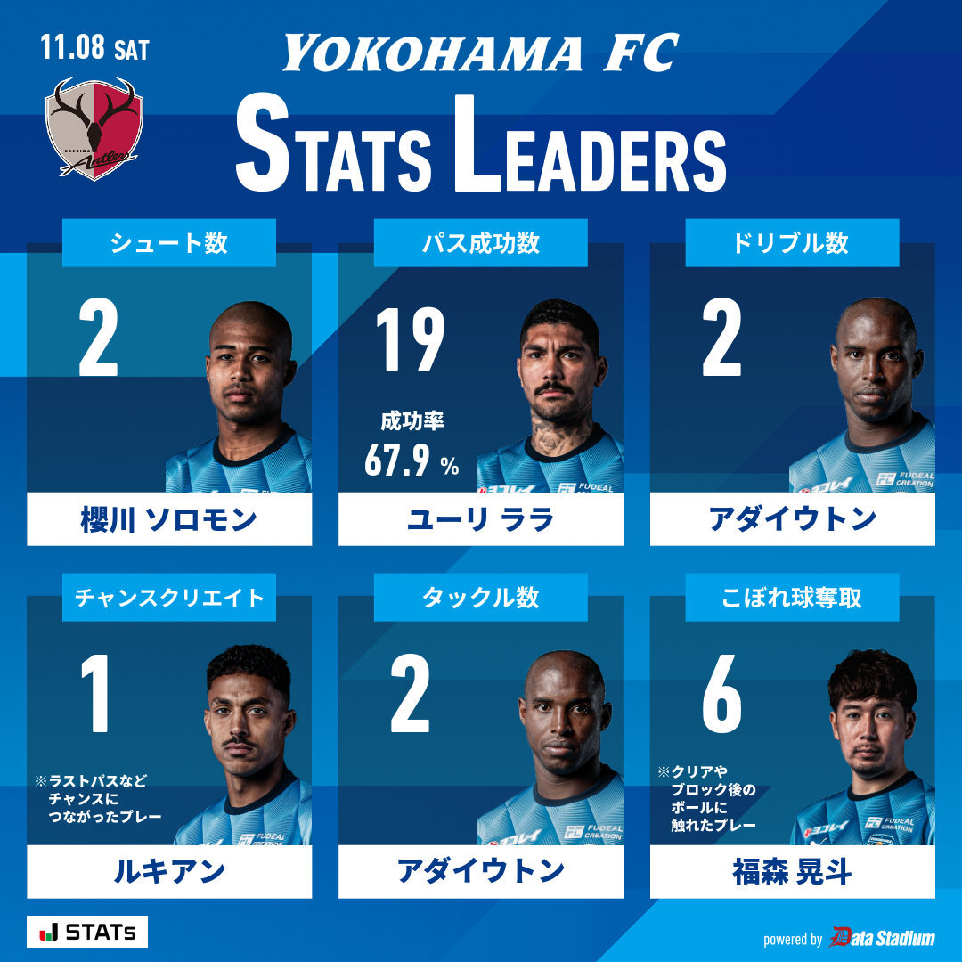 👑本日のスタッツリーダー シュート数: #櫻川ソロモン パス成功数: #ユーリララ ドリブル数: #アダイウトン チャンスクリエイト: #ルキアン タックル数: #アダイウトン こぼれ球奪取: #福森晃斗 #yokohamafc #横浜FC #鹿島横浜FC pic.x.com/ziCWk5rLGQ