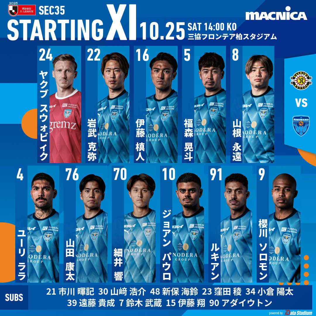 🆚#柏レイソル メンバー GK ヤクブスウォビィク DF 岩武克弥 伊藤槙人 福森晃斗 MF 山根永遠 ユーリララ 山田康太 細井響 FW ジョアンパウロ ルキアン 櫻川ソロモン SUBS 市川暉記 山﨑浩介 新保海鈴 窪田稜 小倉陽太 遠藤貴成 鈴木武蔵 伊藤翔 アダイウトン #yokohamafc #横浜FC #柏横浜FC