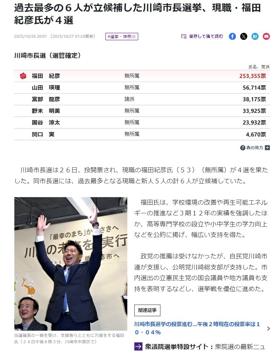 川崎市長に福田氏4選 新人5人を破る sankei.com/article/202510… 無所属の元市議⇒#山田えり#山田瑛理)候補が 当選してほしいと思っていたので、残念です…#福田紀彦 #川崎市長選挙2025 #川崎市長選挙 #川崎市長選