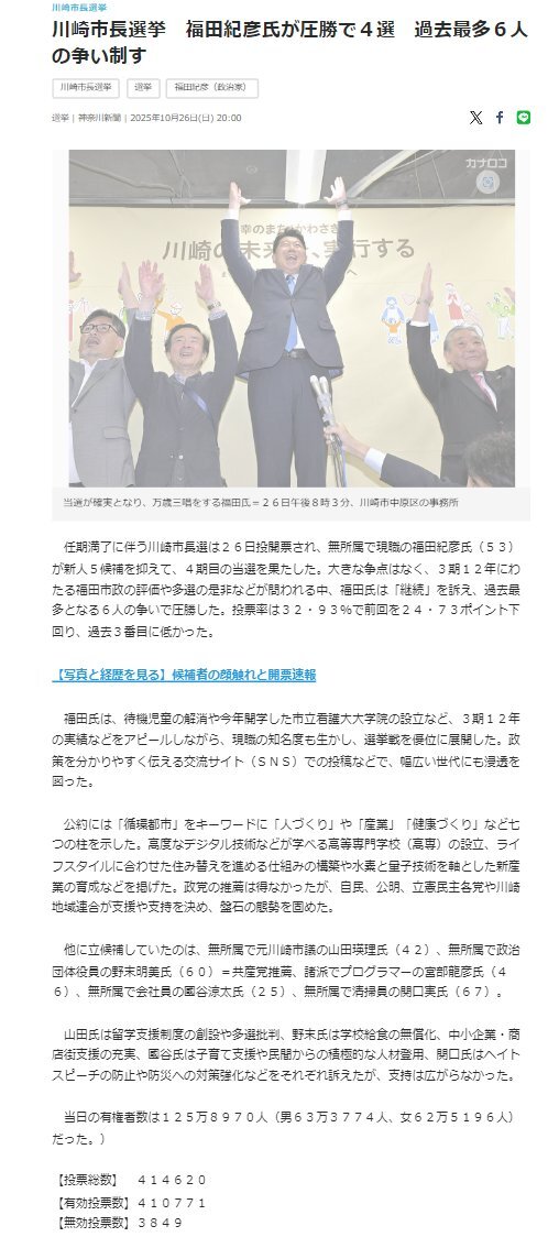 神奈川県 #川崎市長選挙2025 #福田紀彦 川崎市長に現職福田氏の4選確実 politician.cafe/election/1354/