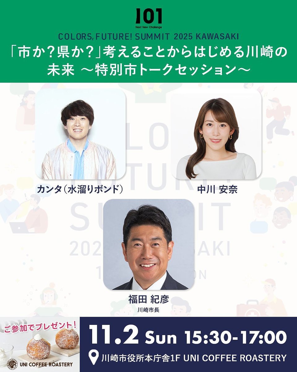 Colors,Future!SUMMIT2025✨ これって「市がやってる?県がやってる?」 #福田紀彦 市長が #水溜りボンド#カンタ さん、#中川安奈 さんと #特別市 トークセッションを実施🗣️ 楽しいクイズで特別市をもっと知ろう! 川崎市が目指す新しいまちのかたちを 一緒に描いてみませんか?🎨 pic.x.com/i8IULiARF9