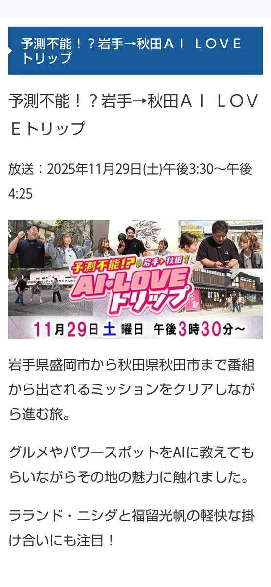 わー嬉しいありがとうございます😊 予測不能!?岩手→秋田AI LOVEトリップ #福留光帆 #ラランドニシダ #秋田朝日放送 #TVer tver.jp/episodes/epep6…
