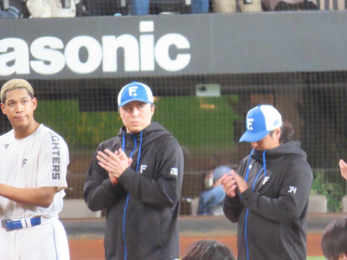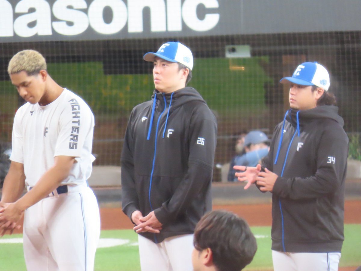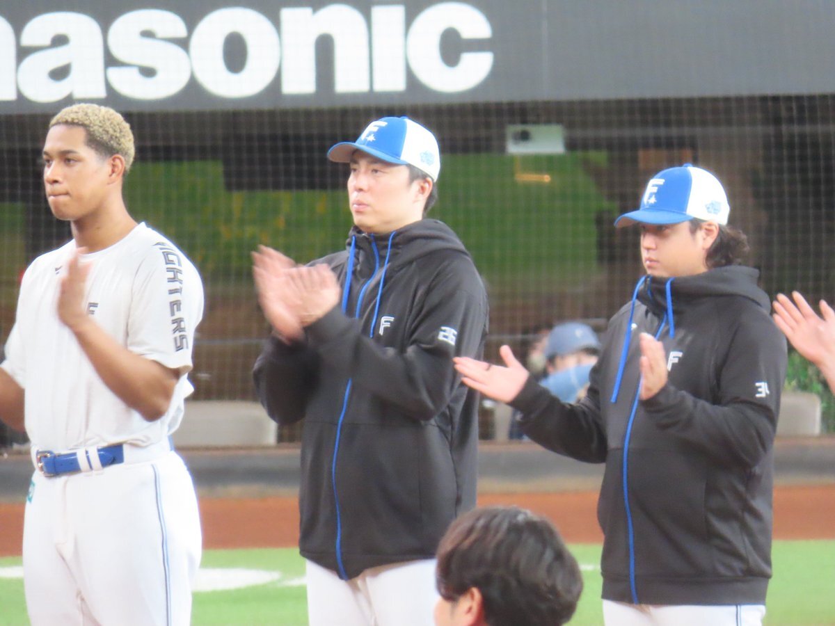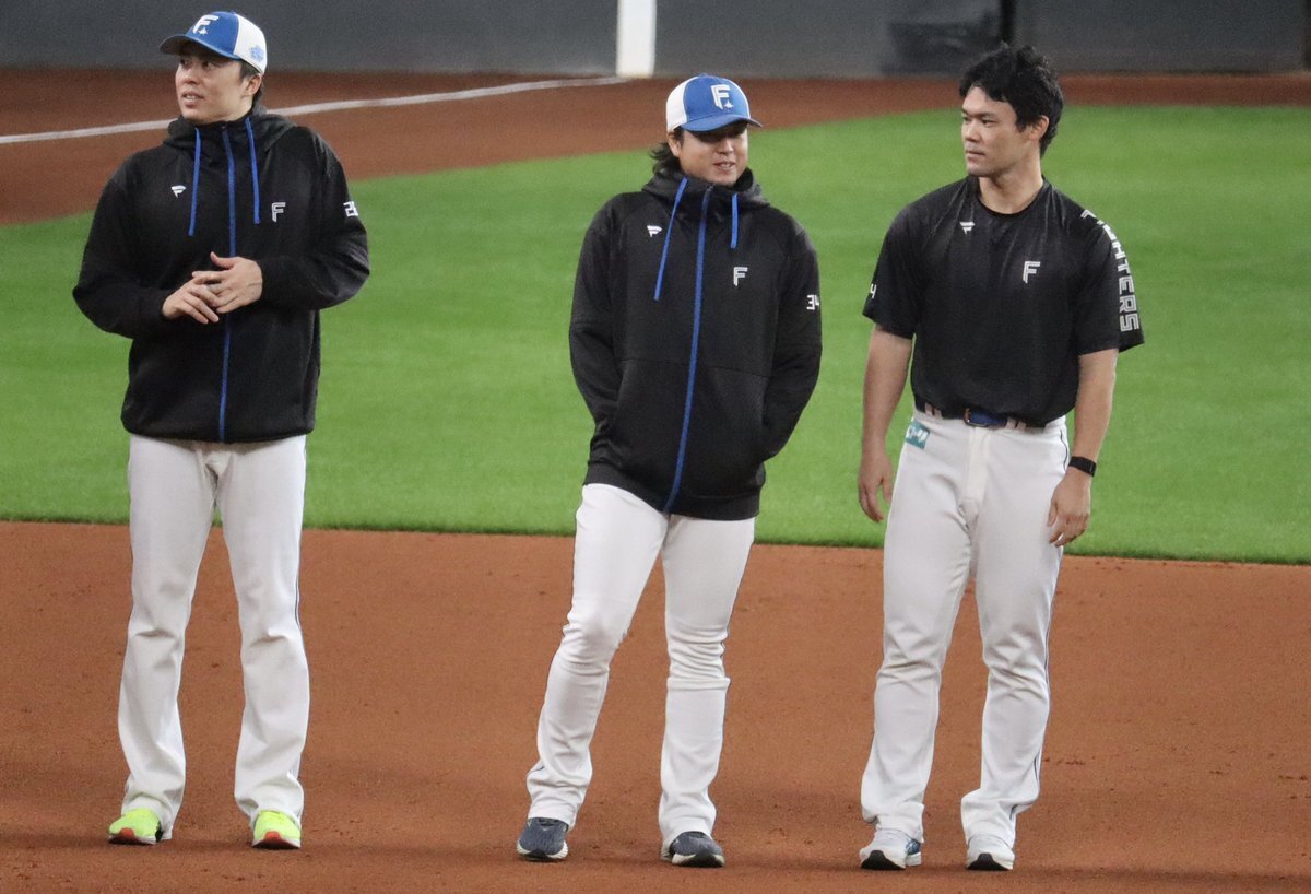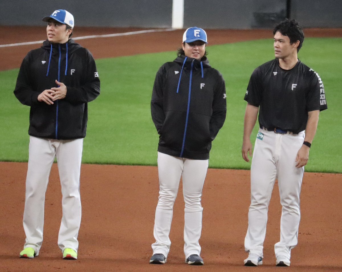 その前に、YAZAWAとぴろみが帽子交換しててYAZAWAの帽子が入らないぴろみ……というくだりがあった😂😂😂 2025.11.2エスコン #lovefighters #今川優馬 #堀瑞輝 #奈良間大己 #福谷浩司 #矢澤宏太 #伊藤大海︀ #伊藤大海 pic.x.com/AoYzv2Pnnv x.com/cyaako_photo_s…