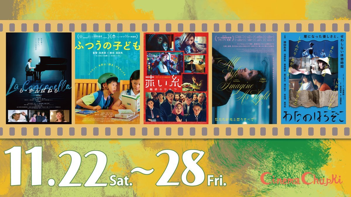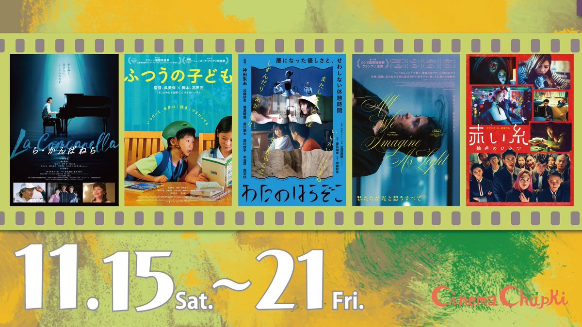 🎬11月15日(土)〜21日(金)*水曜休 10:00- #ら・かんぱねら 12:25- #ふつうの子ども 14:30- #わたのはらぞこ 16:50- #私たちが光と想うすべて 19:10- #赤い糸輪廻のひみつ 🎞️全作品 #音声ガイド #日本語字幕 あり ✅ご予約 chupki.jpn.org/archives/16102 pic.x.com/SHEyFhpqnf