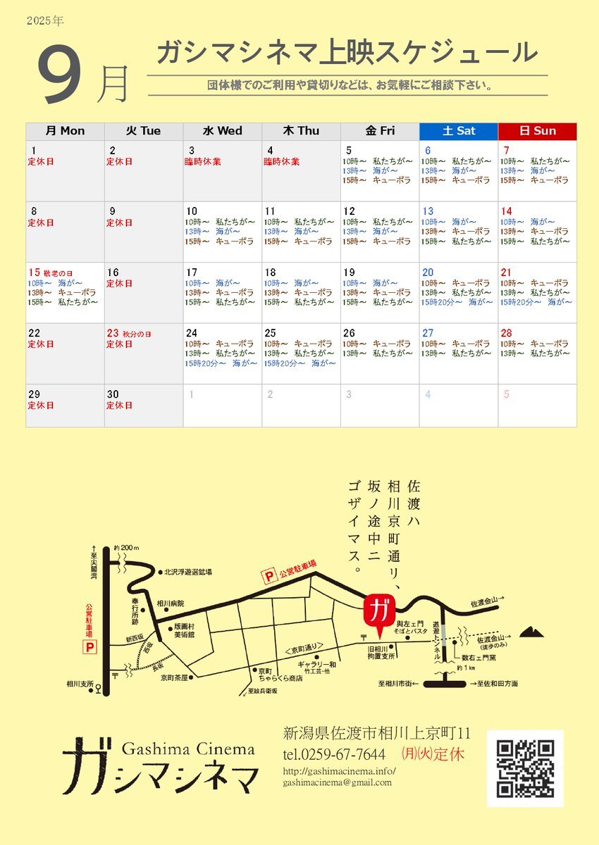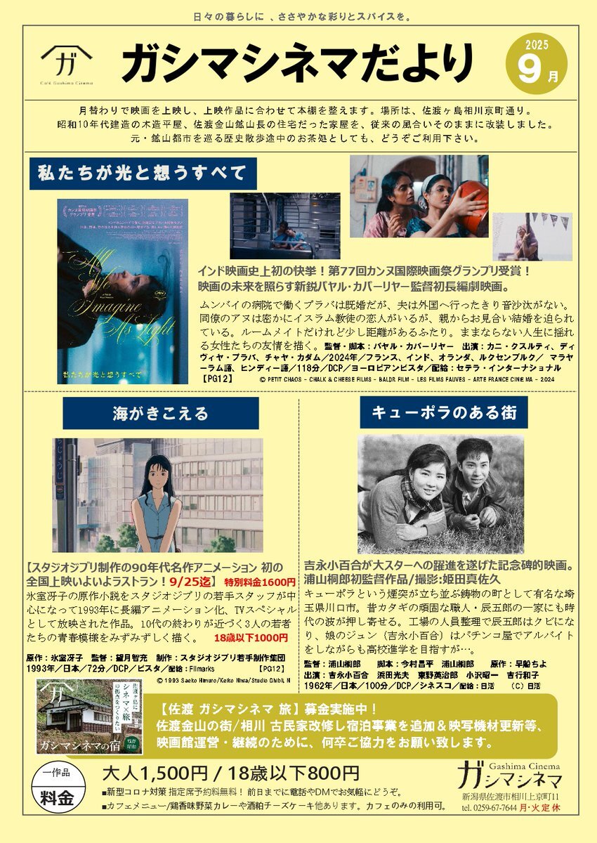 【ガシマシネマだより 2025.09月号~9/28】 ㈪㈫定休 10時~ #キューポラのある街 13時~ #私たちが光と想うすべて 15:20~ #海がきこえる ※注!9/25㈭迄 pic.x.com/x9mgoVGMAu