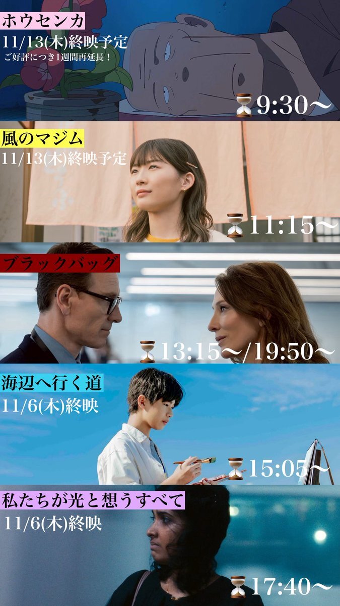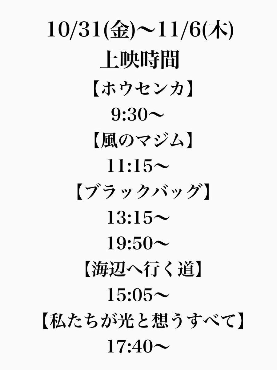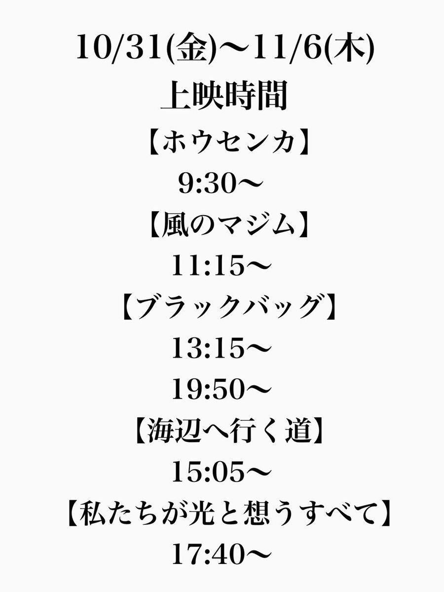 10/31(金)〜11/6(木)の 上映スケジュールはこちらです💁♀️ 明日からはいよいよ 『#ブラックバッグ』 の上映がスタート🔫 🎞️11/6(木)終映予定🎞️ 『#ホウセンカ』 ご好評につき延長上映❣️ 『#私たちが光と想うすべて』 🎞️次週以降の上映有無未定🎞️ 『#風のマジム』 『#海辺へ行く道』 お見逃しなく💨 pic.x.com/exmowYb8ea