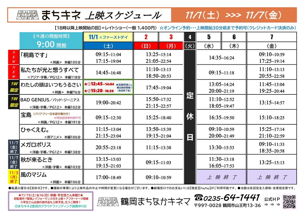 【発表📢】#まちキネ上映時間2025 11月1日(土)~11月7日(金)の上映スケジュールをお知らせ!土曜日のファーストデイには宮森玲実さんが来館🤩 🎬上映開始📽️ #桐島です #私たちが光と想うすべて #わたしの頭はいつもうるさい #バッド・ジーニアス ※4日(火)は定休日です💤 machikine.net/time/ pic.x.com/iLisbCScpO