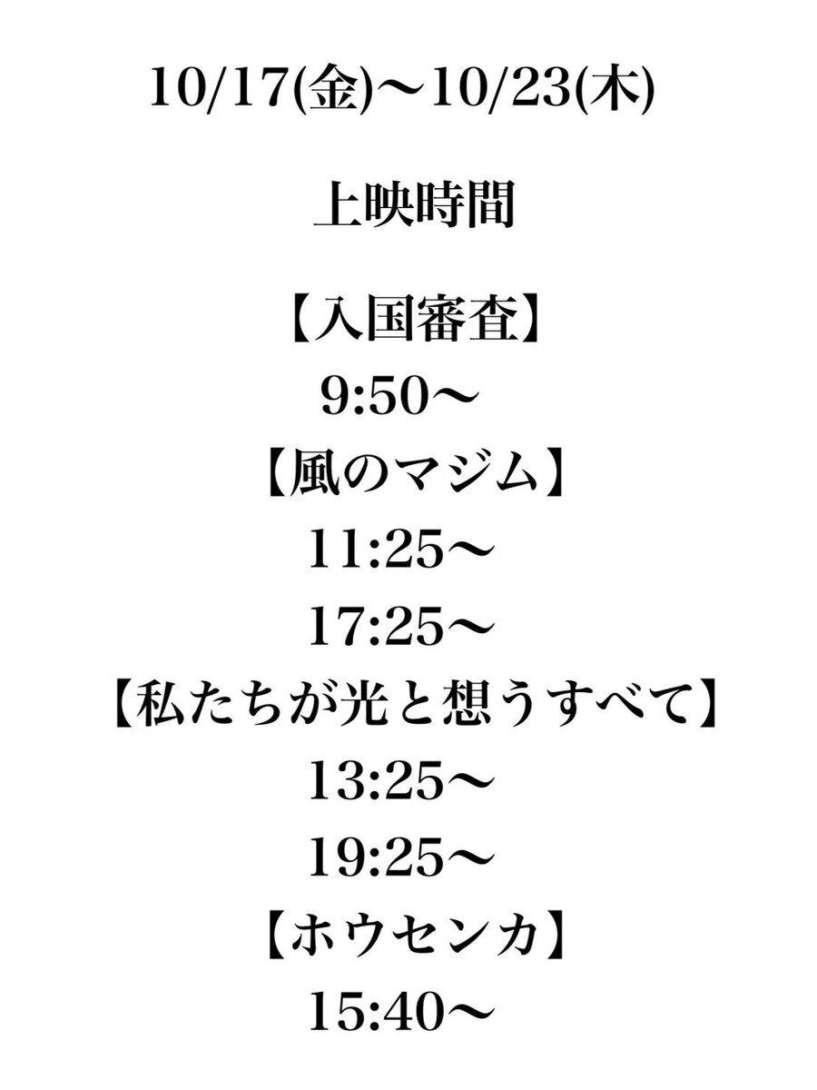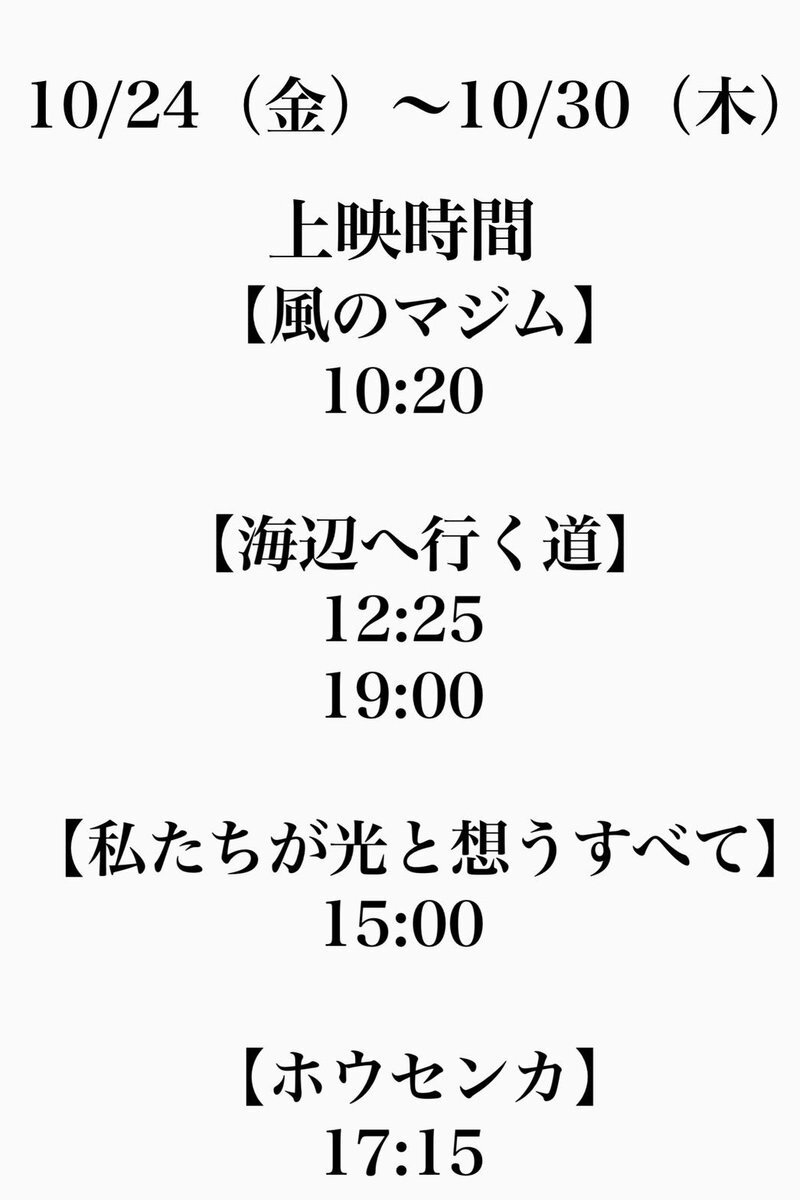 10/24(金)〜10/30(木)の上映スケジュールはこちら💁♀️ 明日から『#海辺へ行く道』が上映開始⛱️ 『#ホウセンカ』は10/30(木)終映予定…! 『#私たちが光と想うすべて』も、次週以降の上映有無は未定ですので、お早めの鑑賞がおすすめです! 『#風のマジム』も好評上映中❣️ ぜひ劇場へお越しください✨ pic.x.com/45XNH4Z71q