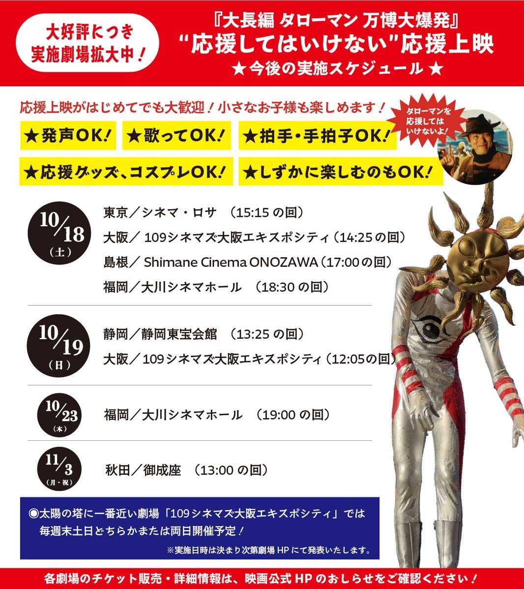 / #応援してはいけない応援上映 今週末も各地で開催! \ ⭐️応援上映が初めての方でも大歓迎! ⭕️発声OK!グッズ・コスプレOK!の特別な上映で #映画タローマン をお楽しみください! ❌タローマンを応援してはいけないよ! さらに! 福岡/#大川シネマホール では10/23(木)の追加開催も決定!