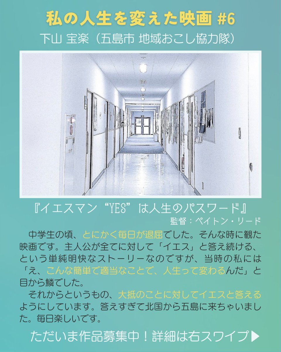 【 #私の人生を変えた映画 】 6回目は、今年から五島市の地域おこし協力隊として活動を始めた下山宝楽( @rcrc_seaotter )さん 伝統芸能の継承をミッションに、日々まっすぐに取り組む姿が印象的! 「やってみます!」と前向きに受け止めるその姿勢はまさにイエスマン🤓✨ x.gd/UAg33 pic.x.com/tL4Z1KWkFG
