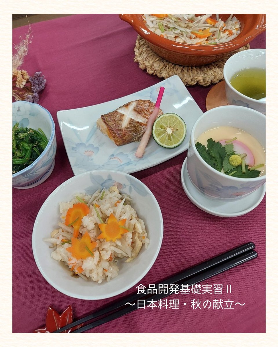 🍁食品開発基礎実習Ⅱ🍱 「日本料理・秋の献立」をテーマに、 炊き込みおこわ・茶碗蒸し ・鯛の塩焼き・ほうれんそうのごまあえを実習👩‍🍳 素材の味が引き立つ、上品な和食が完成しました✨ #十文字学園女子大学 #食品開発学科 #和食の魅力 #秋の献立 #料理好きな人と繋がりたい pic.x.com/ShU9IodRxD