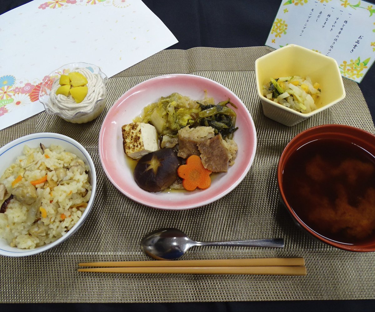 泉陽会ランチ紹介です🍽️ 秋の食材を使ったメニュー🍂 ◯鶏と牛蒡の炊き込みご飯 ◯すきやき ◯柿なます ◯赤だし ◯モンブランプリン #ランチ #今日のランチ #お昼ご飯 #秋のごはん #秋のおかず #秋の献立 #泉陽会 #特別養護老人ホーム #介護福祉士 #介護職 #介護士 #介護の仕事 #職員募集 pic.x.com/RDZHg2l5Cr