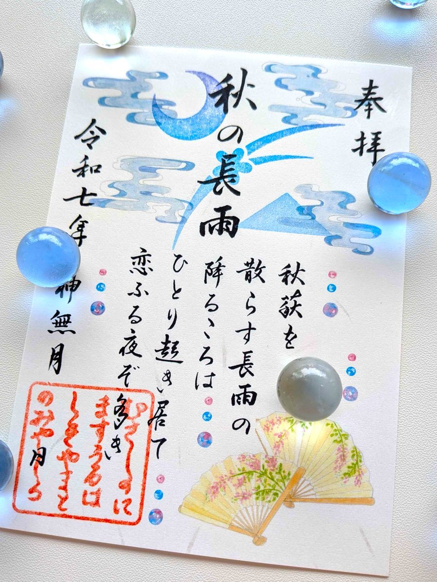 【雨の日朱印のおしらせ】 雨が降りましたので、只今10月の #雨の日朱印『#秋の長雨』を頒布中です。 秋に長くしとしとと降る、静かな雨を指します。 『秋荻を 散らす長雨の降るころは ひとり起き居て 恋ふる夜ぞ多き』 (作者未詳 #万葉集 より) 雨の日のお愉しみに1枚いかがでしょうか☔ pic.x.com/BGreieEQ5u